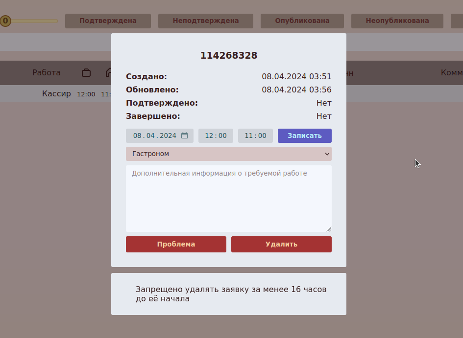 На данный момент можно изменять дату и время заявки даже если она начинается менее чем через 16 часов